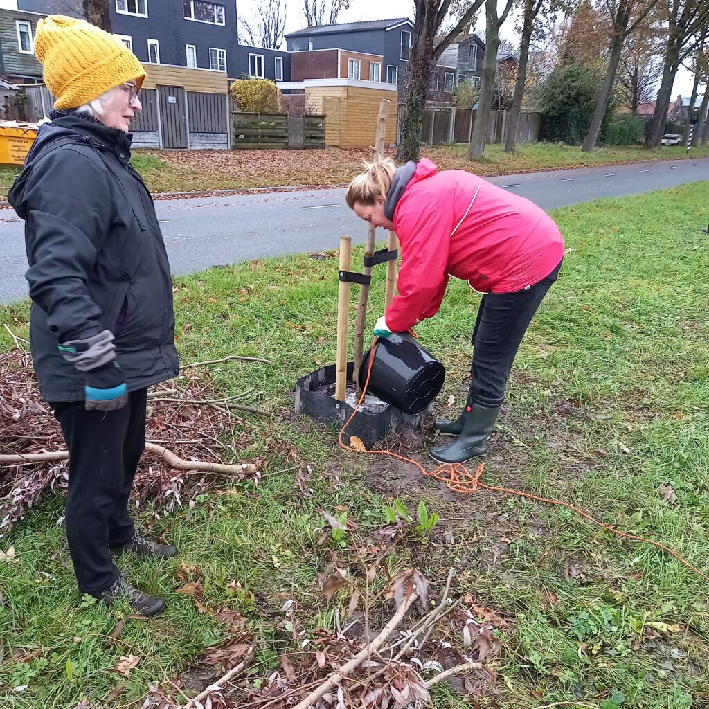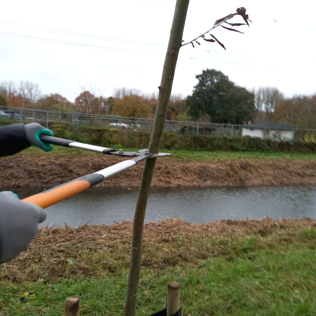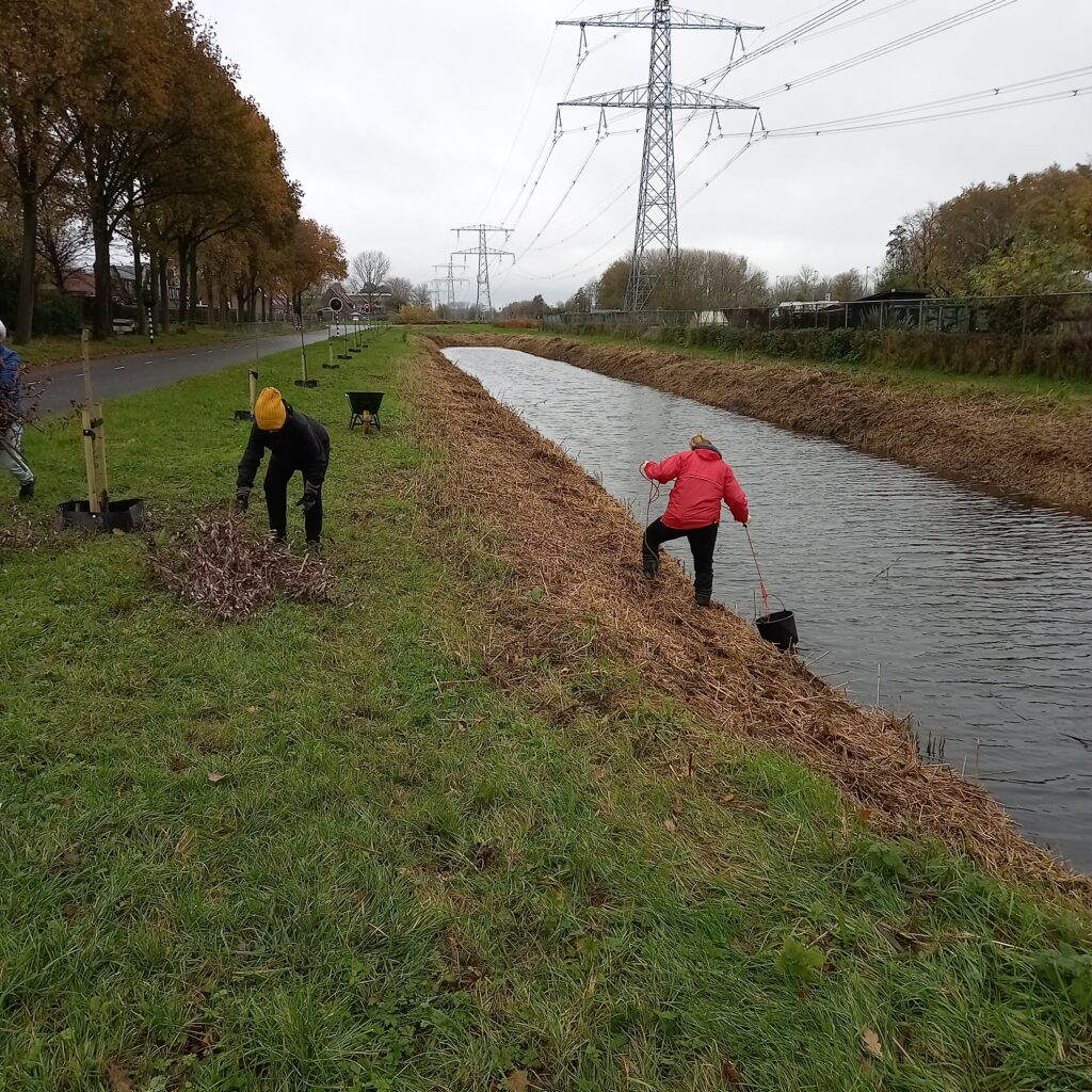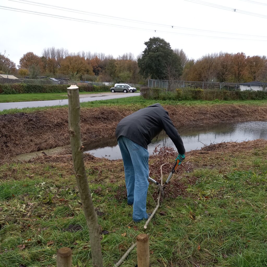 Op 15 november heeft de boswerkgroep met 8 vrijwilligers de laatste hand gelegd aan de wilgenstaken die op de 1e van november zijn neergezet. Op een hoogte van 165cm zijn de staken afgekapt. Hierdoor kunnen de wilgen in het voorjaar vooral daar uitlopen om uiteindelijk een mooie knotwilg te worden. De stammetjes werden ook voorzien van extra water om uitdroging te voorkomen.